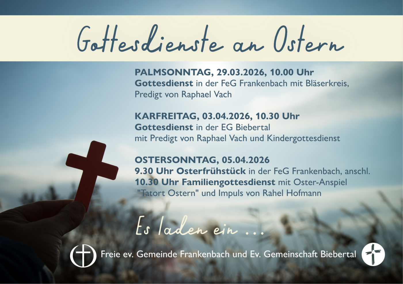 Ostern ist das Fest der Auferstehung Jesu und der Hoffnung auf eine Zukunft mit Gott. Gemeinsam wollen wir diese besondere Zeit bewusst erleben – in Erinnerung an Jesu Leiden und voller Freude über seine Auferstehung. Wir laden dich herzlich ein, dabei zu sein!